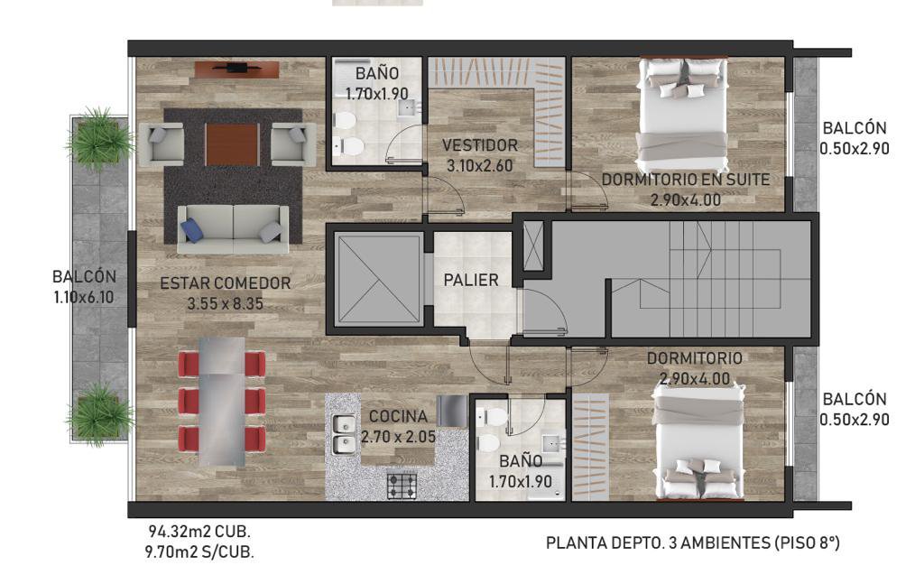 EL DEPARTAMENTO CUENTA CON COCINA INTEGRADA CON BARRA DESAYUNADORA, AMPLÍSIMO LIVING COMEDOR, DOS DORMITORIOS, UNO EN SUITE CON BAÑERA CON HIDROMASAJES, Y VESTIDOR, TOILETTE, BALCÓN CORRIDO AL FRENTE, Y BALCON AL CONTRAFRENTE. PISOS ENTARUGADOS. ES EL UNICO DEPARTAMENTO QUE TIENE COCHERA EN EL EDIFICIO!!!